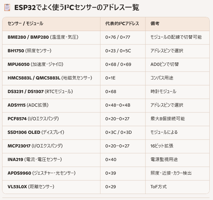 }I2Cセンサーの大体のアドレス表(AIに出してもらいました)