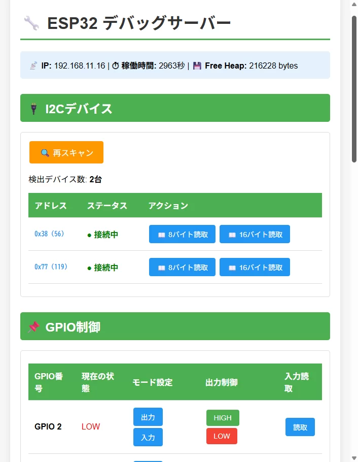 ESP32のI2CとI/Oのhttpサーバデバッガ