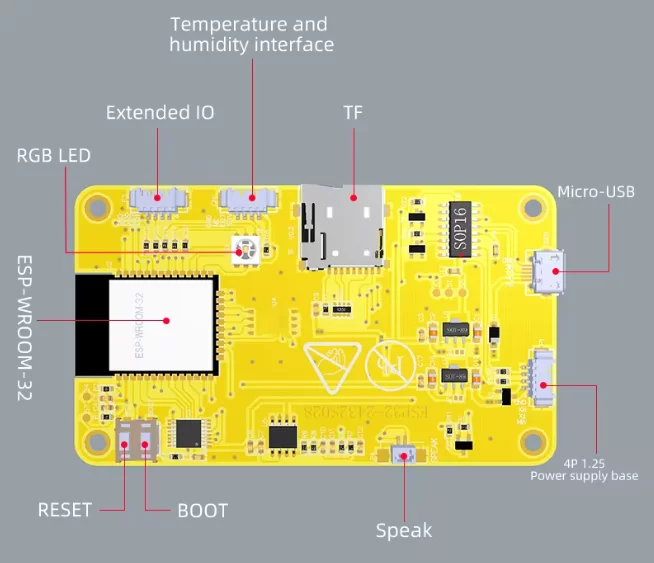 ESP32-WROOM-32を搭載した、2.8インチTFTディスプレイとタッチスクリーン付き開発ボードです。WiFi/Bluetooth通信、オーディオ出力、SDカード、RGB LED、拡張ポートを備えた多機能な統合開発環境を提供します。