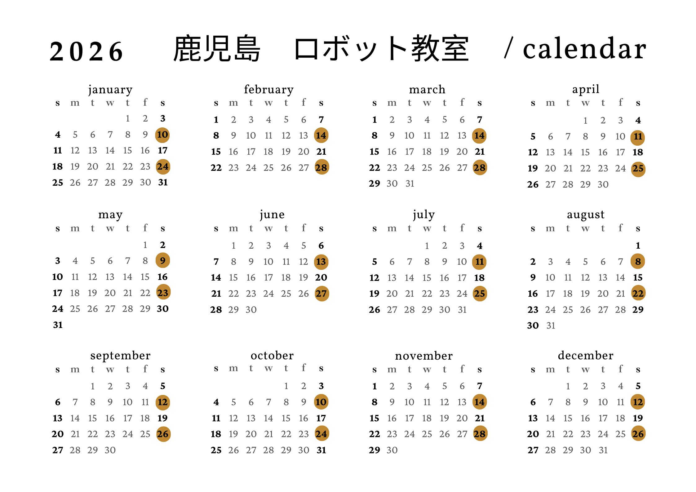 2026年 ロボットプログラミング年間予定お知らせ2026.01.05ロボットプログラミング教室の2026年の年間開催スケジュールをお知らせします。鹿児島中央駅教室は、第2・第4土曜日に実施いたします。予定が変更する場合がありますので、教室に来られる前にこのページをチェックしていただければと思います。関連記事:2024年 鹿児島中央駅教室ロボットプログラミング予定2025年 ロボットプログラミング年間予定2025年 マインクラフトプログラミング年間予定2026年 マインクラフトプログラミング年間予定