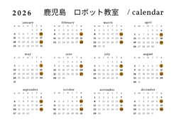 お知らせ2026年 ロボットプログラミング年間予定 ロボットプログラミング教室の2026年の年間開催スケジュールをお知らせします。鹿児島中央駅教室は、第2・第4土曜日に実施いたします。 予定が変更する場合がありますので、教室に来られる前にこのページをチェックしていただければと思います...2026.01.05お知らせ予定鹿児島中央駅教室お知らせ鹿児島中央駅教室予定