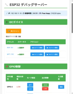 技術関連ESP32のI2CとI/Oのhttpサーバデバッガ ESP32のI2CとI/Oのhttpサーバデバッガ ESP32のI2C簡易デバッガを作成しました。 できること ・I2Cアレススキャナ I2Cのアドレスをスキャンして今接続されているI2Cデバイスを確認する ・I...2025.11.16技術関連記事