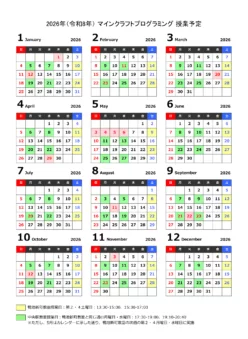2025年12月~2026年2月の 鴨池新町教室のマインクラフトプログラミングの予定です。 土曜日クラス(鴨池新町教室)時間帯:13:30-15:00、15:30-17:002025年 12月13日(土)、12月27日(土) 202...